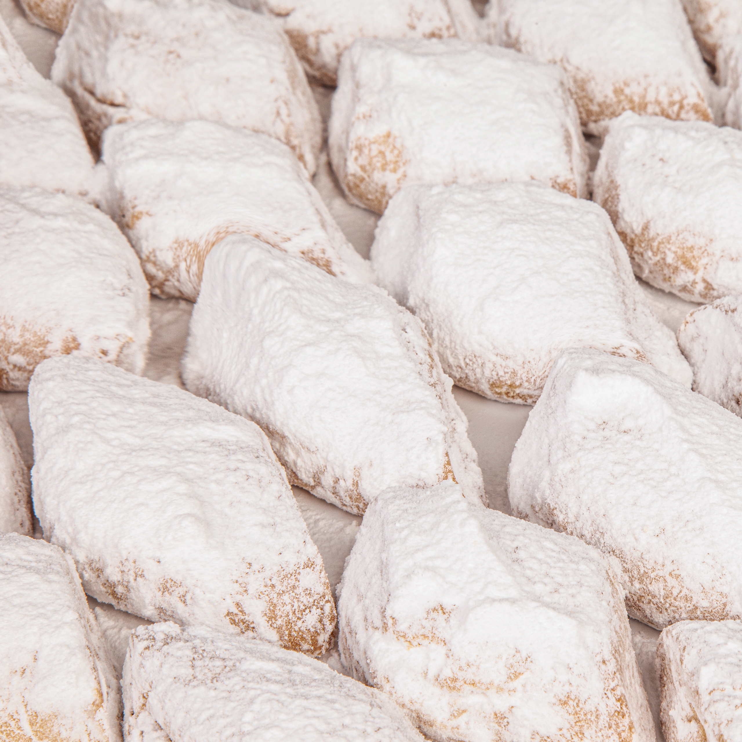 A NUT FREE shortbread type cookie dusted with copious amounts of icing sugar.