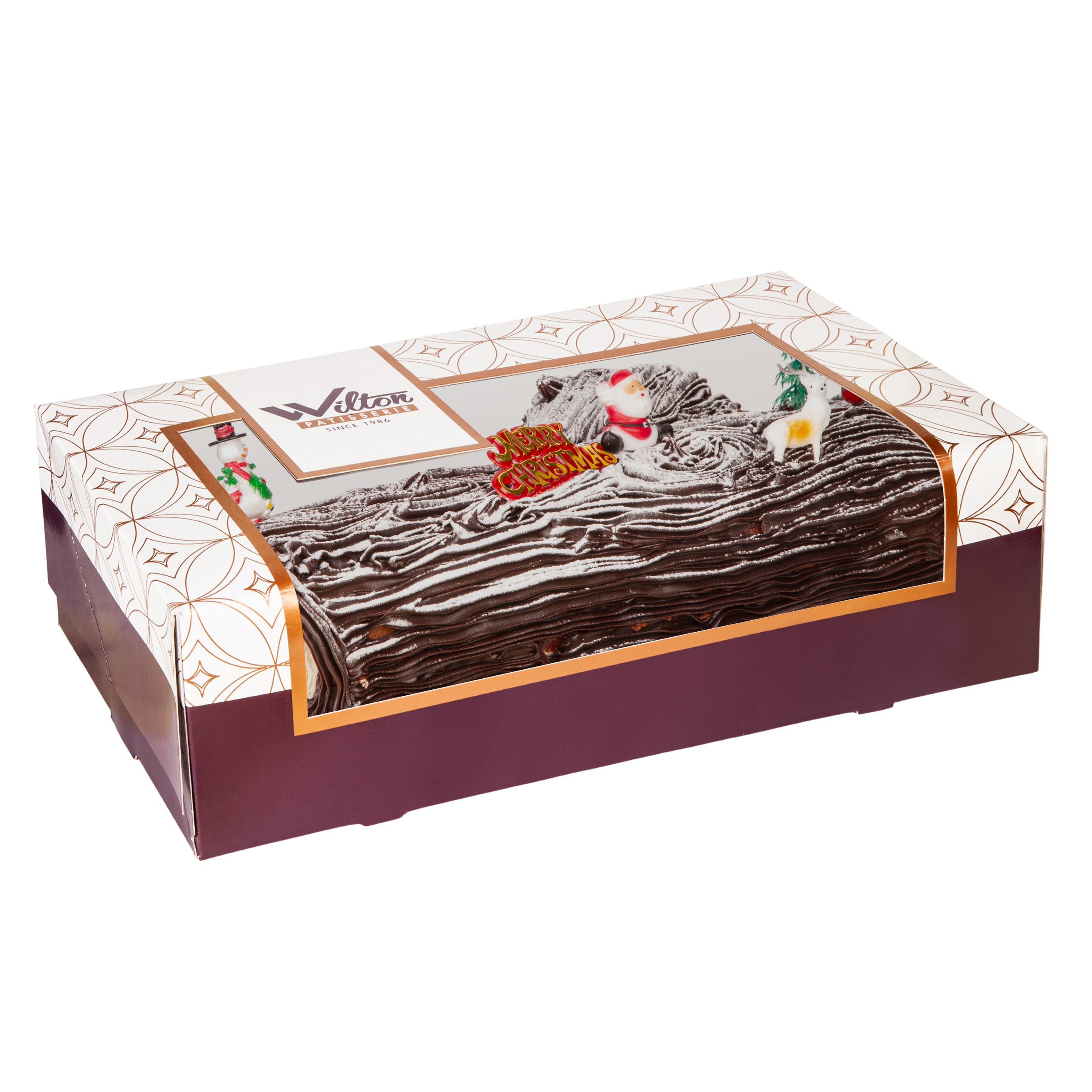 A festive rolled sponge filled with fresh cream & red cherry filling, coated in chocolate ganache to look like bark, decorated with snow sugar & seasonal accents.